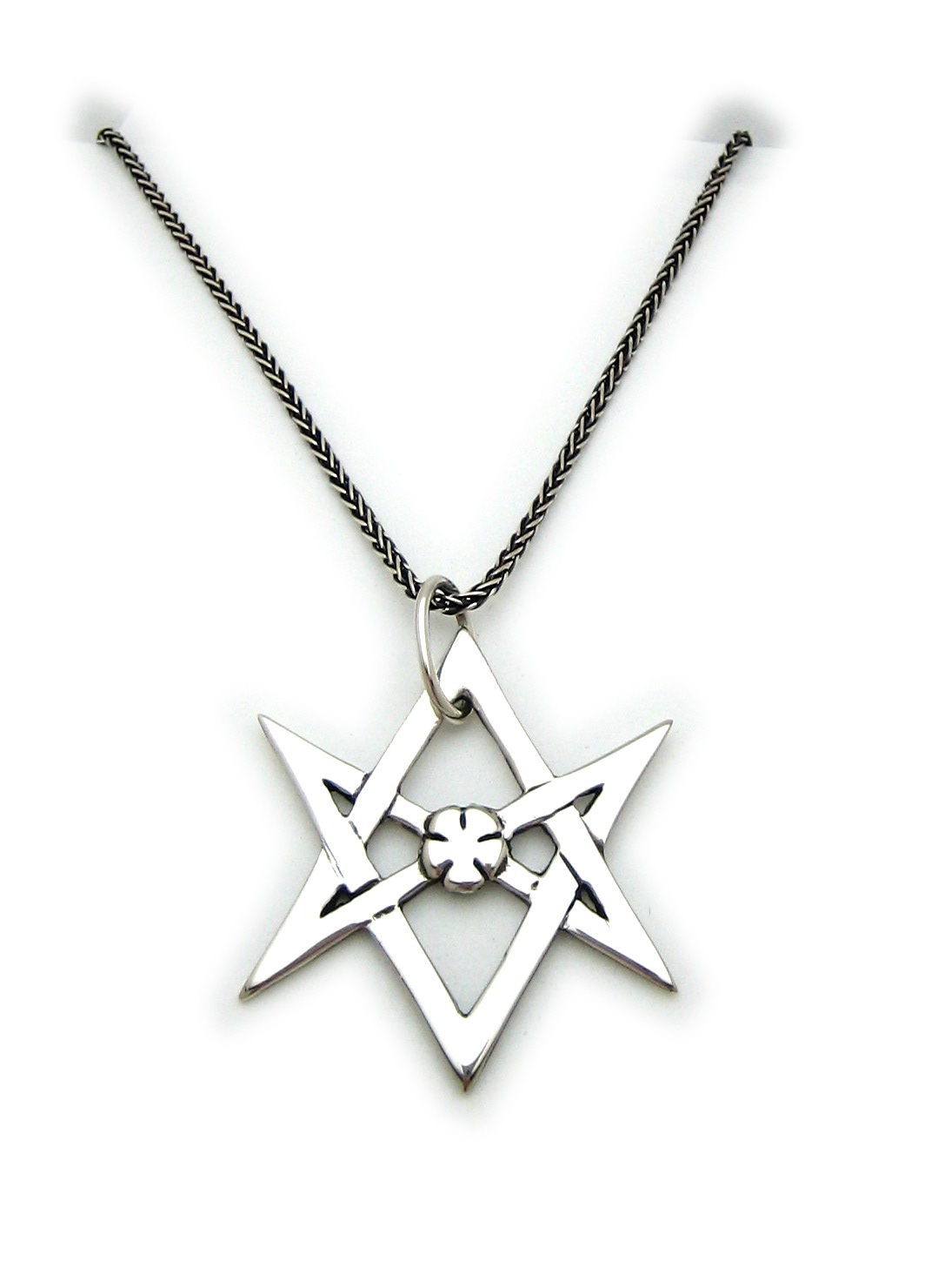 Sterling Silver Unicursal Hexagram with an 18" wheat rope chain, or the chain of your choice selected below. Available without the 5 petal Rose by request. Sized "1-1/2" x 1-3/8"".