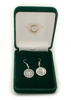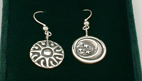 A set of earrings, using the Moon for the left ear, to represent the more feminine side of humanity, and the Sun in the right ear, for the masculine side. With either hook style earrings. Post style available by request, no extra charge.